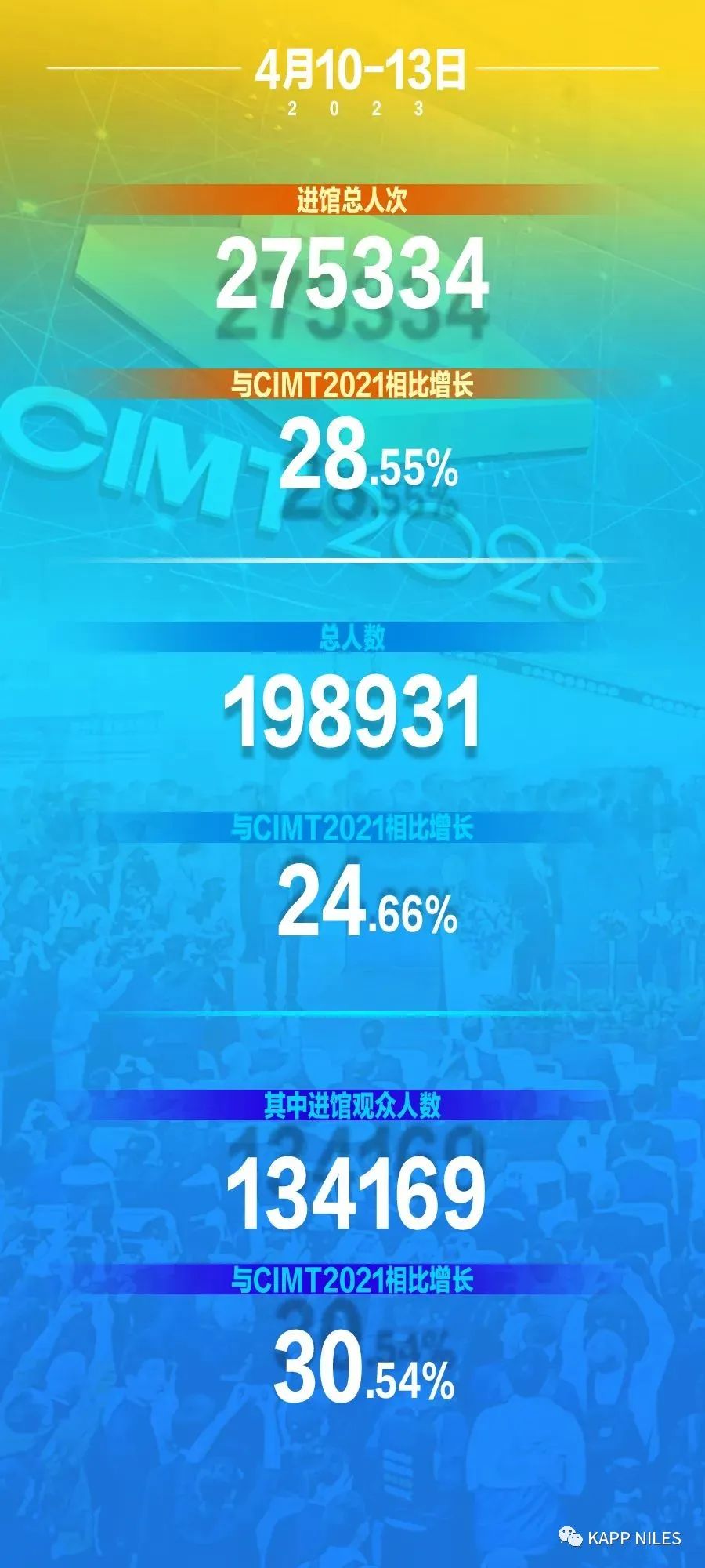 According to the data of access control system of China International Exhibition Center (Shunyi Hall), from April 10th to 13th, the total number of attendance by person-time was 275,334, an increase of 28.55% compared to CIMT2021; The total number of attendance by person was 198,931, an increase of 24.66% compared to CIMT2021; Among them, the total number of visitor entering the venue was 134,169, an increase of 30.54% compared to CIMT2021. (The data doesn't include the staff of sponsor and other supports)